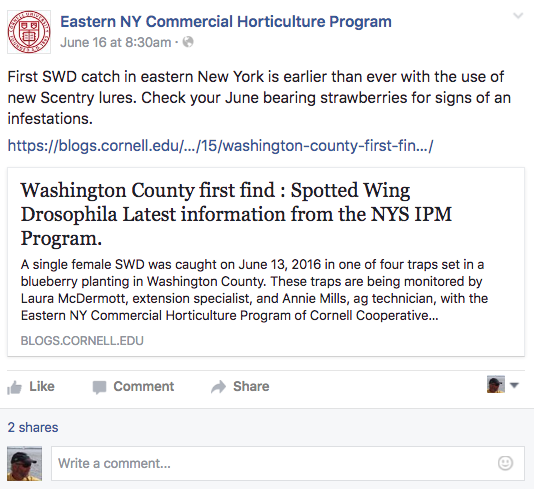 • Fire blight strikes are still wanted for streptomycin resistance testing. If you find fire blight, we would like to know about it. Give us a call (413-478-7219) or e-mail. Needless to say, any shoot blight should be removed when the weather is dry. Be sure to cut far back from where the infection appears to start. Here are some fire blight reminders gleaned from the Cornell ENYCHP Tree Fruit E-Alert for June 21st, 2016 (Thanks Dan Donahue and Anna Wallis):