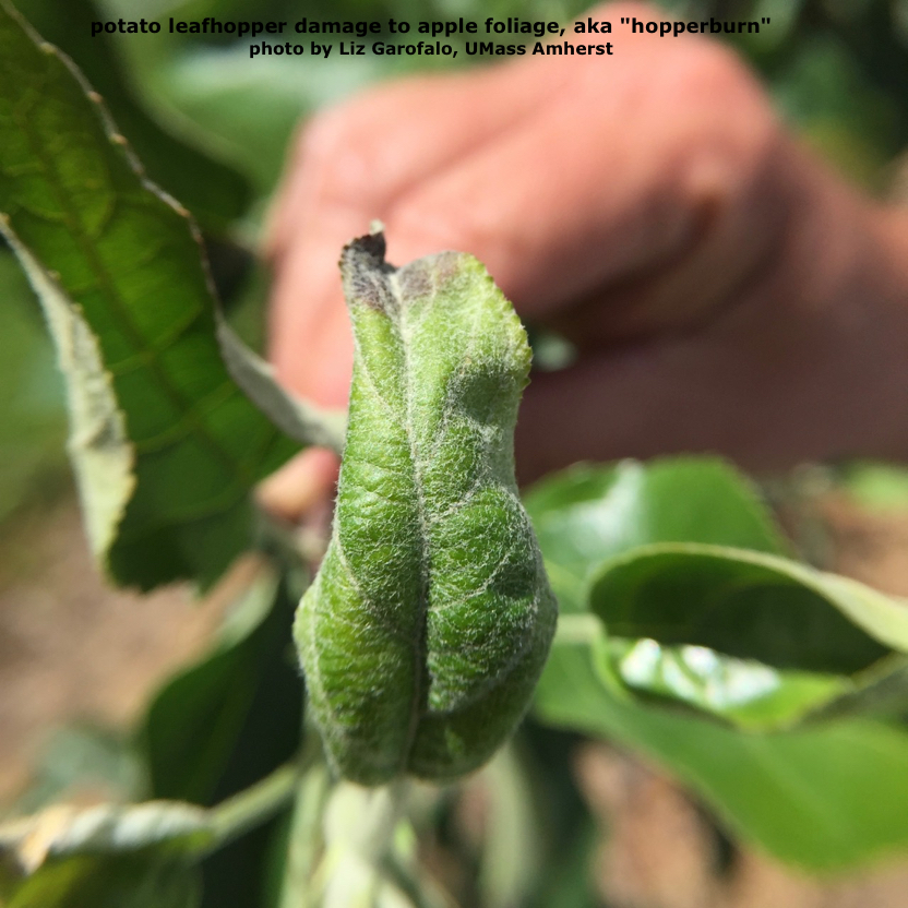 Pretty quiet this week so far. Peach hand thinning is ongoing, apple hand thinning to begin ASAP. (Getting it done earlier vs. later is better for return bloom.) Sprays for obliquebanded leafroller going on, pheromone trap catches continue to be high. Potato leafhopper has appeard with a vengeance in top-worked trees with succulent shoot growth and "hopperburn" (picture) already being observed there. Scab is out there where fungicide sprays were lacking. Cherry harvest has begun, and given the weather, brown rot (picture) is bad where it has not been adequately controlled. (Yuk!) I've heard reports of serious hail damage in western NY, the crop is down in Michigan because of spring freeze -- the Eastern apple crop is going to be down this year. Watch the sky, but there is nothing to do about it, cool air aloft spells hail, let's all wish it out of here though.