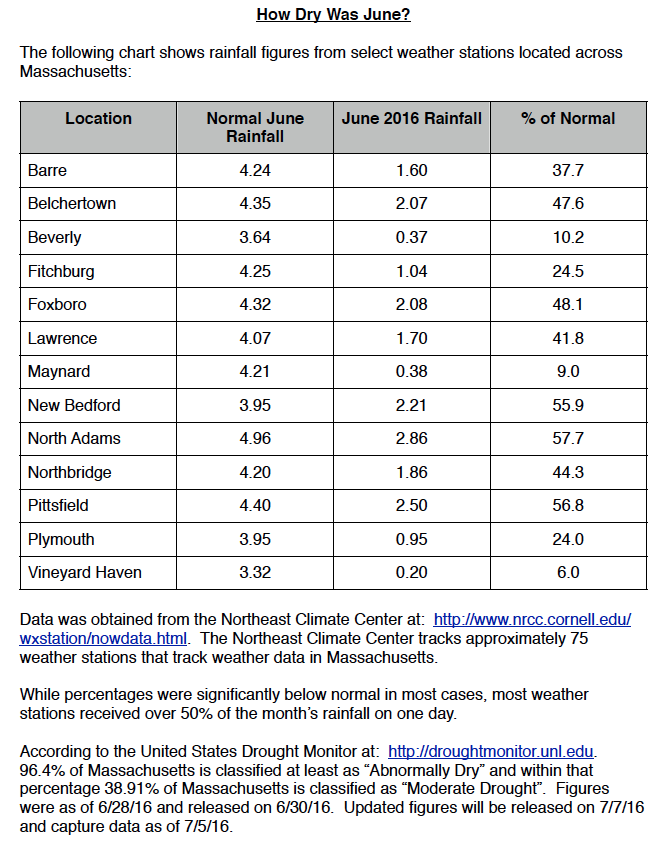 Really what should be on our minds is how dry it has been and how it might affect the crop. No peaches to worry about, but certainly apples are under some stress and have started to set terminal buds. Apples are pretty resilient, but need some moisture to grow and size fruit. I was beginning to question the need for irrigation as the last several years have seen plenty of moisture, but now many orchards are under a "moderate drought" status. This can't be good. Now I am convinced, that in addition to deer fence, trickle irrigation is a !!must-have!!! in any new orchards going in the ground. Thanks to Tom Smiarowski, UMass Risk Management/Crop Insurance Education program, for compiling the June precipitation info below.