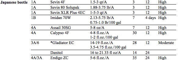 • Japanese beetles (JB) are not numerous (yet) but out there. See Peter Jentsch's latest blog post on this subject for details on this little beast. As a fact, they prefer Honeycrisp foliage, so check those trees first for signs of JB. Treatment options as listed in the 2015-16 NETFMG are: