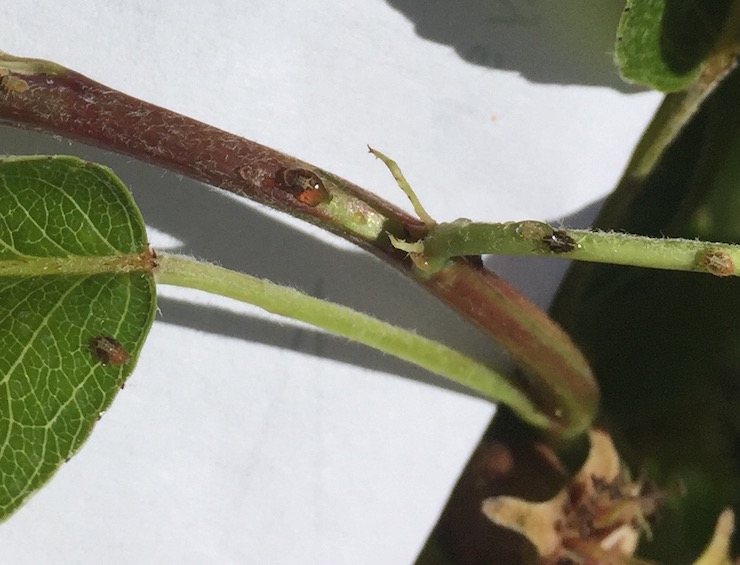 The one, very key management practice you should be employing right now is not chemical but cultural. Yes, I know, you have a million things to do and going out into your relatively small pear blocks to hand strip water sprouts from the trees is really low on your list. It is, however, a very important means of controlling this pest. Right now the primary season’s leaves and shoots have hardened off and psylla nymphs cannot readily feed on them. They instead feed on the tender water sprouts shooting up into the trees, often shielded from good pesticide coverage. Removing these summer shoots deprives the nymphs of their only food source. No food source = no further growth and they die, just as surely if you sprayed them with an insecticide that may or may not work. One of the biggest challenges you will face in managing this pest is the ease with which they develop resistance to insecticides.