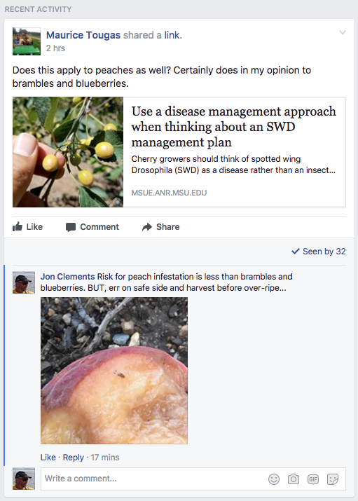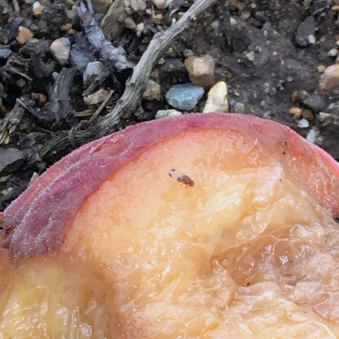 • I was asked today if Spotted Wing Drosophila (SWD) was an issue in peaches? My answer was, well, maybe, but keep up on harvest, don't let peaches get overly ripe on tree, practice sanitation (pick up drops) and spray insecticide if you can't keep up on above or have any doubts. SWD will get in peaches (and nectarines, and plums), but like any other fruit fly, they take the easy route out and will definitely infest (and breed) in rotten or otherwise damaged fruit (see pict). This year SWD has appeared on the scene early and we've also seen good conditions for fruit fly infestation and population build-up. First time problem in cherries this year we have observed. I would not let your guard down unless you can pick every just barely tree ripe peach. Clean up the best you can, stay on top of harvest, and if in doubt, spray insecticides. See stone fruit insecticide recommendations for SWD.