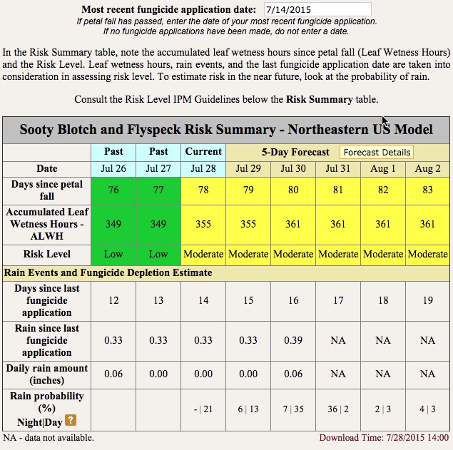 Other than brown rot management for peaches and nectarines as referenced above, sooty blotch/flyspeck and rots of apple (aka summer diseases) are top of the list right now. (Although I did recently find some nice mildew on Honeycrisp the mildew magnet, see it here, but right now you need to focus on mildew management next spring.) There are two online tools to help you manage (i.e. time) your summer fungicide program for summer diseases, AgRadar, and NEWA. AgRadar says you need to maintain "continuous fungicide coverage" until app. 30 days before harvest. "Continuous fungicide coverage" depends on type of fungicide used and how much rain there is between applications. Fungicides are basically batched into two groups: the protectants Captan and and Ziram (Group B); and fungicides with after-infection activity such as Pristine, Topsin-M, Flint, captan + phosphite (Group A). Group B is good for a 14 day (2 week) spray interval OR 1.5 inches of rain, whichever comes first. Similarly, Group A is good for 21 days (3 weeks) between sprays OR 2.0 inches of rain. Pretty simple. AgRadar presents comprehensive tables predicting fungicide depletion and when it is time to re-spray. For example, see the *FLYSPECK* tables for Belchertown. NEWA takes a slightly different approach. For example, using NEWA and assuming a last spray date of 14-July, then MODERATE RISK is predicted beginning 28-July (today) and if rain is forecast for 2 or more days, it is time to apply an appropriate fungicide (pictured). Please take the time to learn and use these weather-based IPM tools for more effective summer disease management. If any questions, contact Dan Cooley or myself.