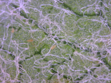 Apple rust mites on apple leaf, 1-August 2016, app. 200 magnification; note