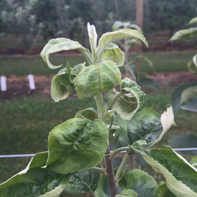 Apple rust mite damage observed on some young trees. I have been puzzled in the past by this kind of leaf-curling/discoloration, wondering if it was mildew (Cooley says no). Note the curling and brown patches. I finally looked under a scope and indeed confirmed a heavy infestation of rust mites at 200 power. (They are tiny!) Consensus seems to not worry about it too much as they are food for mite predators, but, they kind of bother me a bit, can't make things any better for drought-stressed trees. Not all over the place, although I have seen it in Honeycrsip in the past.
