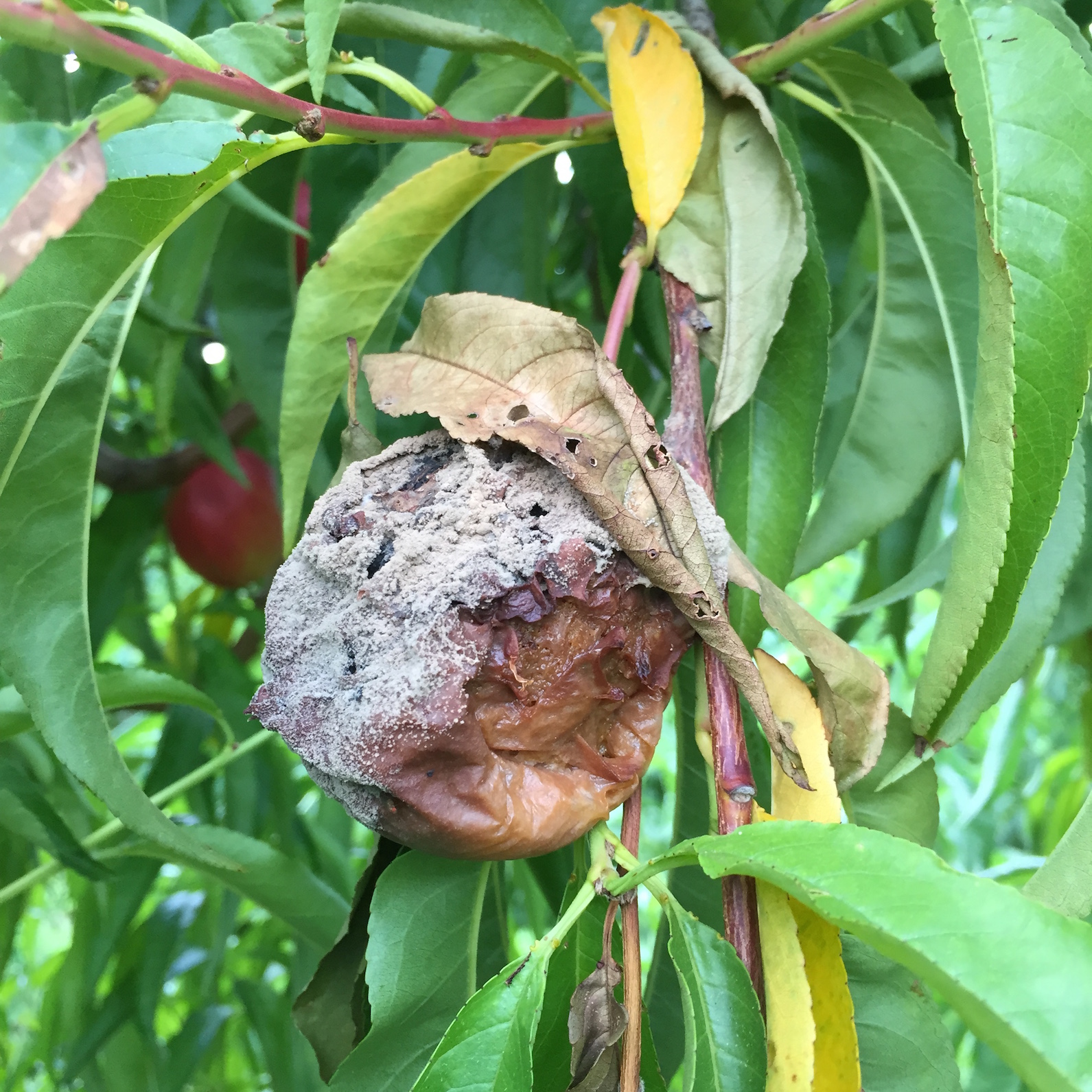 Brown rot of peaches(and nectarines) is rampant where fungicide sprays have been weak or non-existent. Please see the brown rot management recommendations from Rutgers: