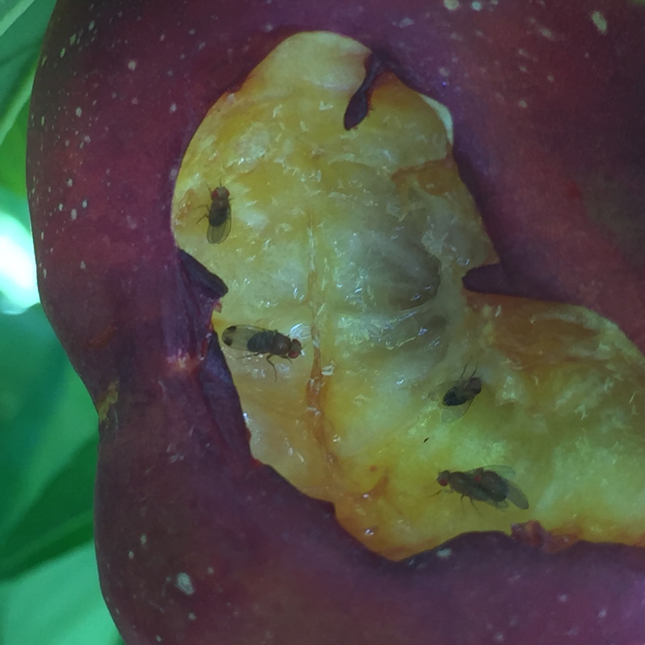 Spotted wind drosophila (SWD) has been found in peaches (as well as appearing in other crops). As long as you keep up with peach harvest, ie.don't let fruit get too soft, SWD should not require insecticide treatment in peaches.