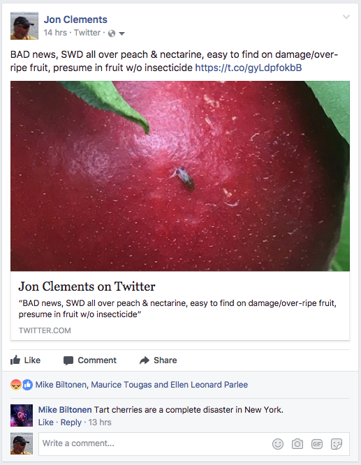 We are up to our eyeballs with peach harvest here at the UMass Orchard. Redhaven is just about ready to be picked, signaling the brunt of the peach harvest season, however, it will go well into early September. Spotted wing drosophila (SWD) are easy to find in damaged/rotten/dropped peaches, and particularly nectarines. (Does anyone really like to grow nectarines?) Our best advice is to pick just barely tree ripe fruit ASAP, practice sanitation (remove rotten fruit) to the best extent possible, and seriously consider insecticide applications for SWD (Delegate, 1 day PHI or Exirel, 3 day PHI -- do not mix with Captan) if you get behind on harvest. SWD has been observed on sound fruit, so it's likely they are laying eggs and infesting good, otherwise sound fruit. Here are SWD insecticide recommendations for stone fruit...and BTW, if anyone has any evidence of SWD larvae in otherwise sound fruit, please let us know!