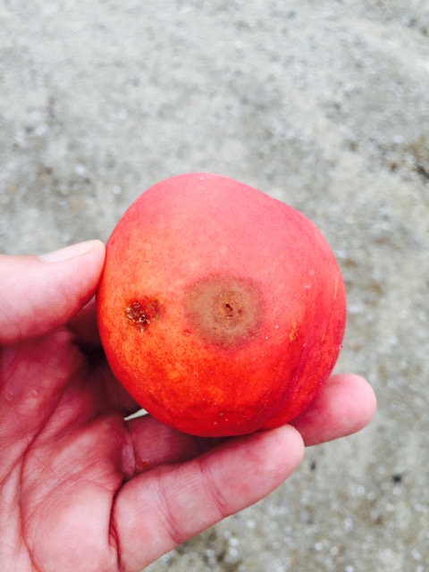 SWD male (with wing spots) and female (lower left, laying egg?) on Fantasia nectarine, 10-September, 2015 |