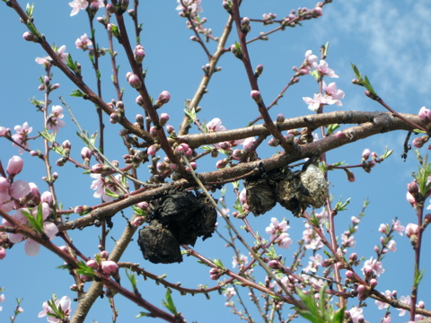 Mild, wet weather favors brown rot/blossom blight infection of stone fruit -- peaches, nectarines, plums, cherries. A reminder that last year's mummified fruit still in the trees is a significant source of infection. (See picture below! Arghh!!) Step one of IPM for brown rot it to get those mummified fruit out of the trees and onto the ground! Step two is to apply a fungicide during bloom when weather conditions favor infection. Fungicide options for brown rot/blossom blight are numerous. Resistance is an issue. Perhaps the best, most comprehensive reference I could find on fungicide options is here from Cornell. For 2009, Quash (Valent) is also registered for control of brown rot in stone fruit (at least Massachusetts). I hope you find the above Cornell reference useful, and do consider applying at least one fungicide during bloom. That is one component of a season-long IPM program for managing brown rot in stone fruit.